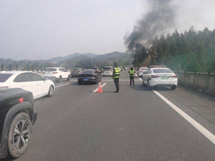 为避免火势蔓延引发次生事故,执法人员将现场人员紧急疏散至安全区域。随后,赶到的高速集团救援车辆及119消防车赶到现场将火扑灭,好在救援及时,此次事故并未造成人员伤亡。