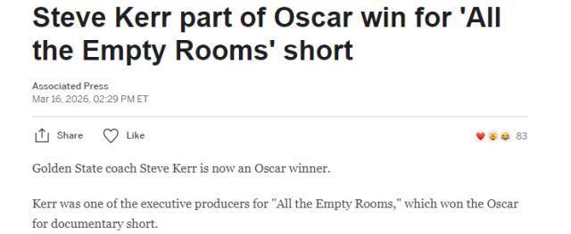 勇士主帅史蒂夫·科尔又增加了一项重要荣誉。科尔是纪录片短片《静室为证(All the Empty Rooms)》的执行制片人之一短线配资炒股,该片荣获第98届奥斯卡最佳纪录短片奖。科尔也成为继科比、库里和奥尼尔之后第四位获得奥斯卡奖的NBA人士。