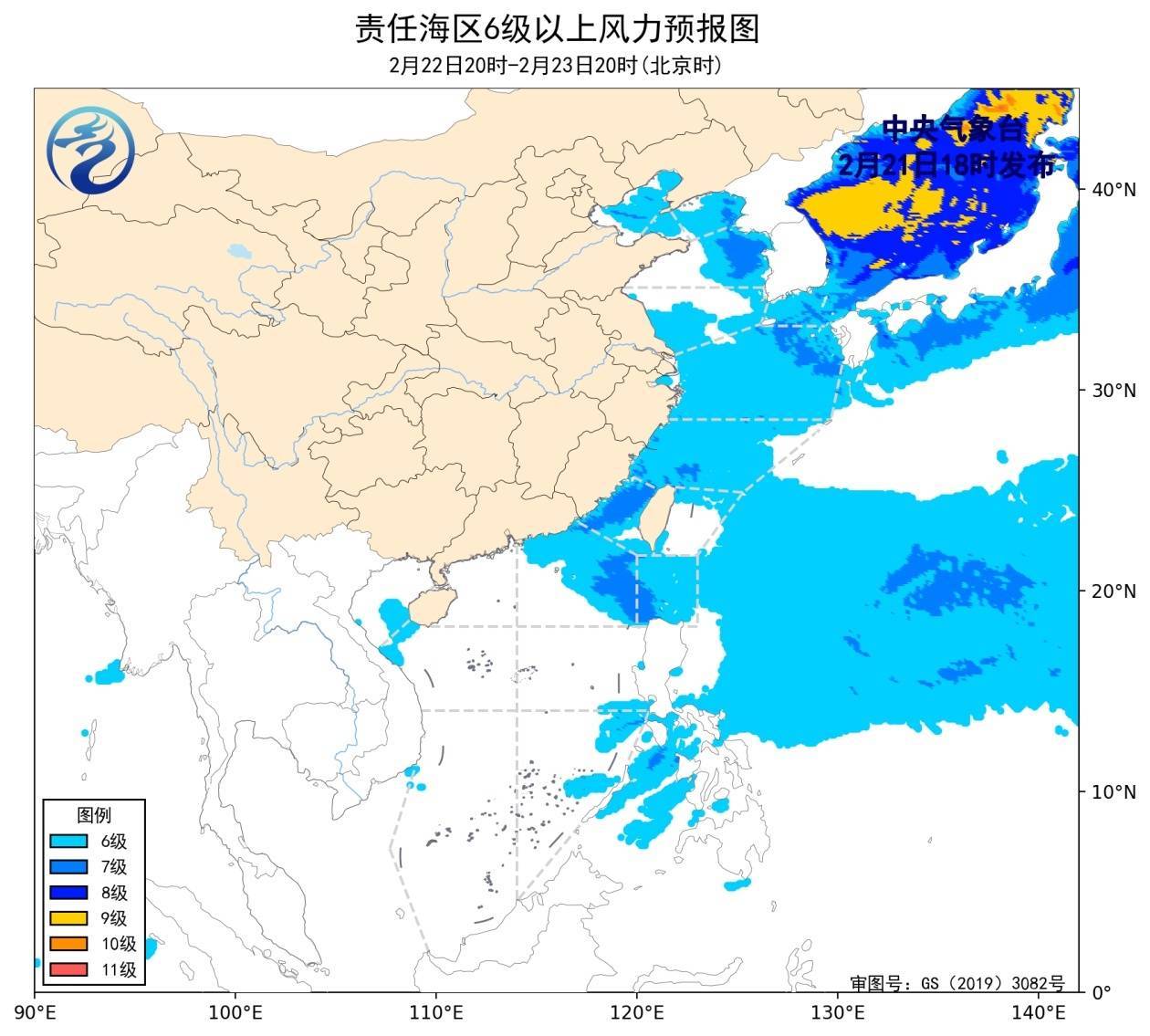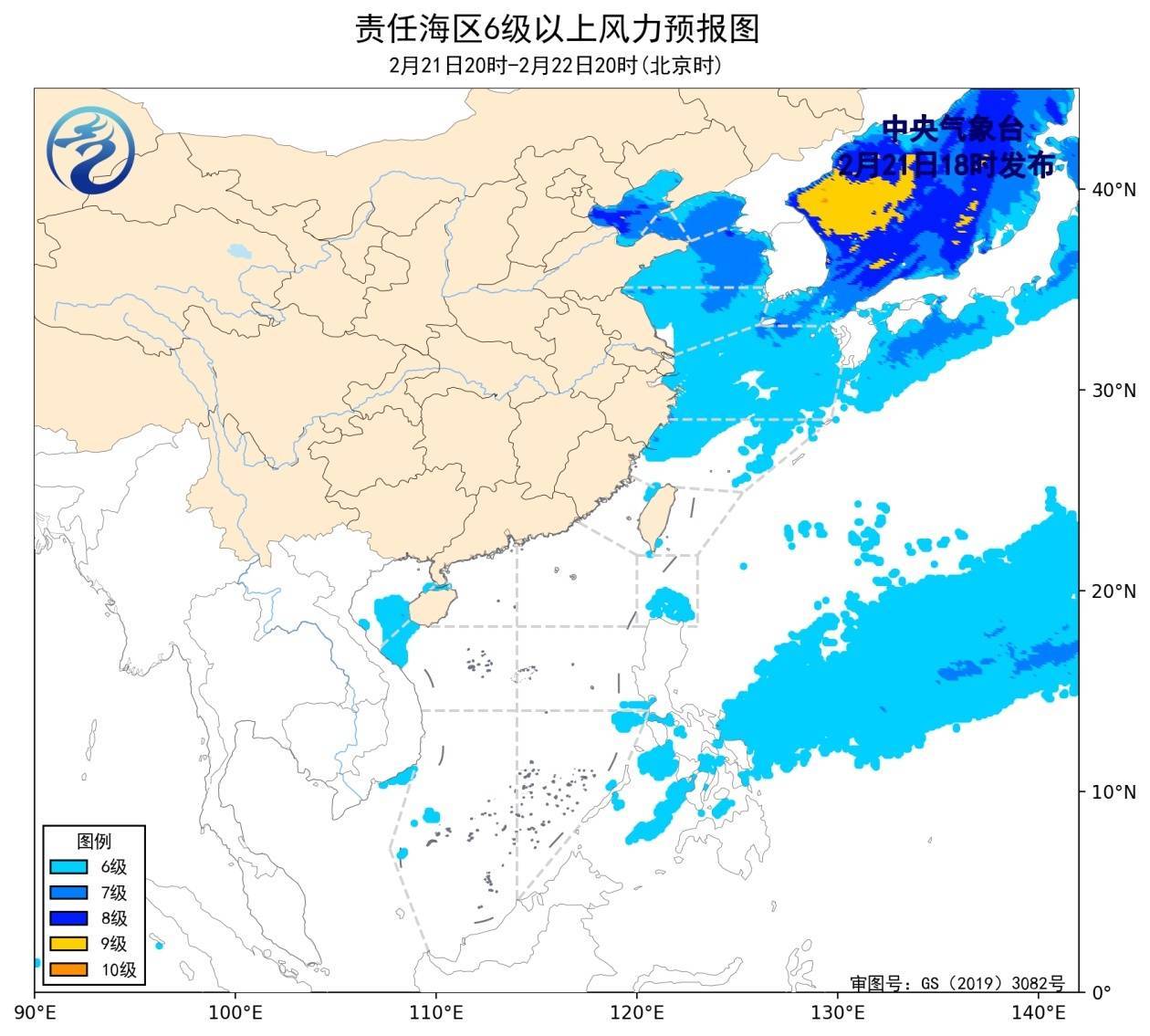 r2月21日02时至14时,渤海、南海西南部海域出现了5~6级、阵风7级的东北风或偏北风,黄海大部海域出现了5~6级、阵风7级的偏南风。