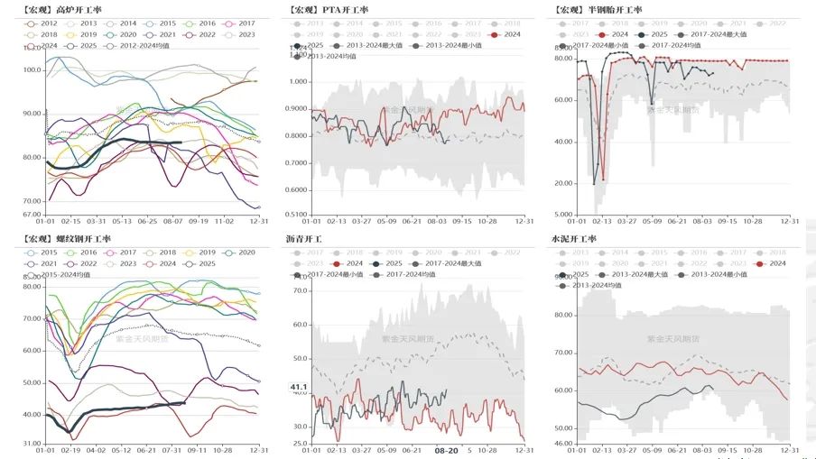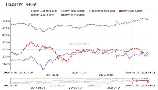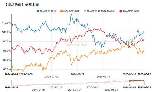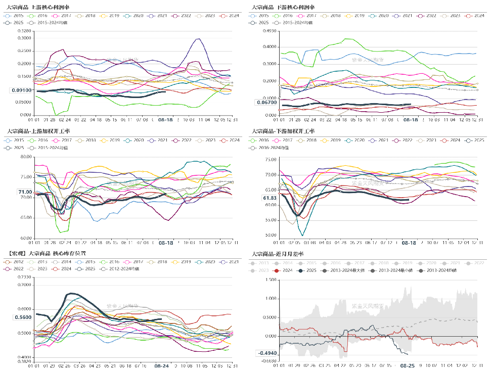 商品高频宏观:从大宗商品高频中观指标来看,近期供给端调控的“反内卷”政策使得上游利润率大幅走强;而需求端并未有显著改善,下游利润率仍维持偏弱水平;因此,近期上游开工率逆季节性回升;而下游开工率则仍处于低位;进而库存出现逆季节性累库趋势,需警惕后续进一步累库压力;月差率近期大幅走弱,正套策略预计表现不佳。