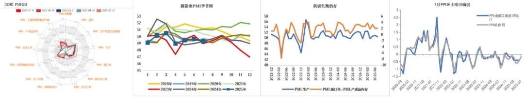 7月制造业PMI还呈现以下特征:内需修复乏力,叠加抢出口透支,需求端较弱,需求类指数均处荣枯线下方;生产端在传统淡季出现回落,但需求端的弱势导致供需失衡仍存;此外价格指数上行,原材料价格和出厂价格指数均大幅反弹,但采购指数下行,结合原材料库存指数的下行,反映需求不足的制约,企业对于上游的涨价,采购积极性相对不高。