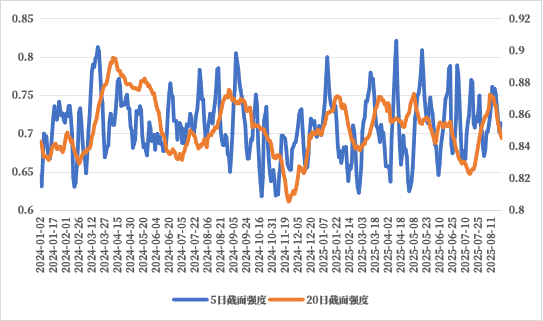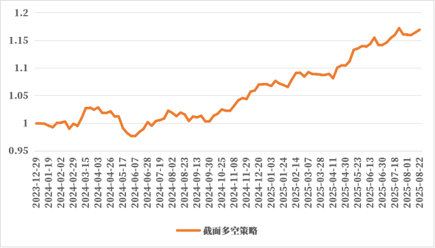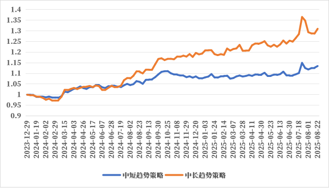 8月以来“反内卷”政策情绪消退,商品市场宽幅震荡,品种走势出现来回反转,同时板块间强弱关系也出现反复轮动,市场截面强度回落,不利于截面策略表现。但拉长期限来看,8月以来整体呈现油脂油料强于其他板块的分化特征,因此截面策略小幅反弹。后续来看关注当前板块间强弱关系的稳定性,警惕后续宏观层面的冲击导致品种共振上涨或品种间强弱关系轮动带来的回撤。
