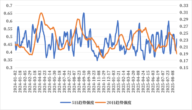在“反内卷”情绪消退后,商品市场缺乏新的驱动,市场整体呈现宽幅震荡走势,反转行情较多。从市场趋势强度也可以看出,短期和中期趋势强度均回落至低位,市场环境不利于量化CTA策略表现。我们观测的趋势策略管理人在大幅回撤之后,近期出现企稳。当前商品基本面仍偏弱,需求端仍然无显著好转迹象,因此单从供给端调整的反内卷政策暂且无法带来商品大的趋势上涨行情,预计商品市场趋势仍然反复。但鲍威尔超预期转鸽,降息预期大幅提升,可关注后续降息带来的CTA表现机会。