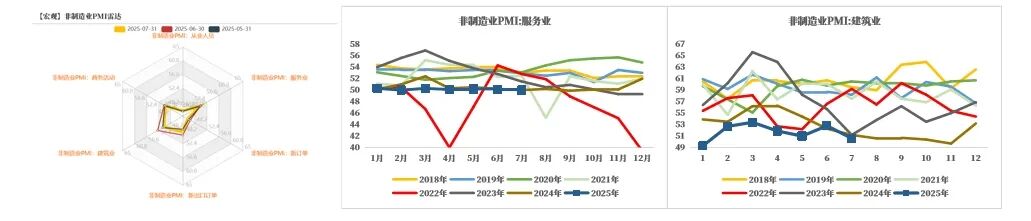 7月服务业PMI录得50.0%,较上月回落0.1个百分点;建筑业PMI录得50.6%,较上月大幅回落2.2个百分点。