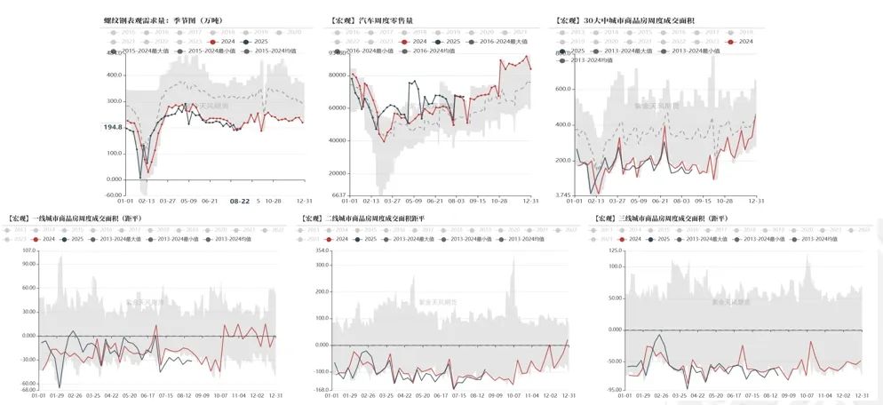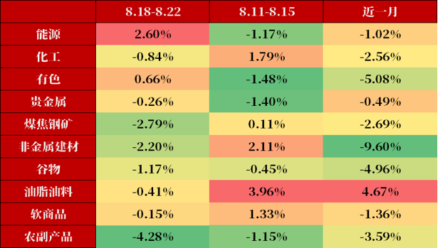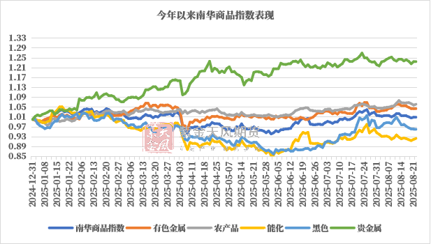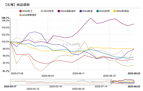 在“反内卷”情绪消退后,商品市场缺乏新的驱动,向基本面回归,市场整体呈现震荡偏弱走势,反转行情较多,板块间强弱关系也出现反复轮动,但整体呈现油脂油料偏强,而有色和黑色系走弱。基本面来看,黑色板块需求端未有显著改善,有色板块受供给偏紧和美元走弱支撑;美俄谈判后油价企稳,虽市场看空情绪浓厚,但预计下行空间有限,维持震荡走势。当前需求端仍然无显著好转迹象,因此单从供给端调整的反内卷政策暂且无法带来商品大的趋势上涨行情,预计商品市场趋势仍然反复。