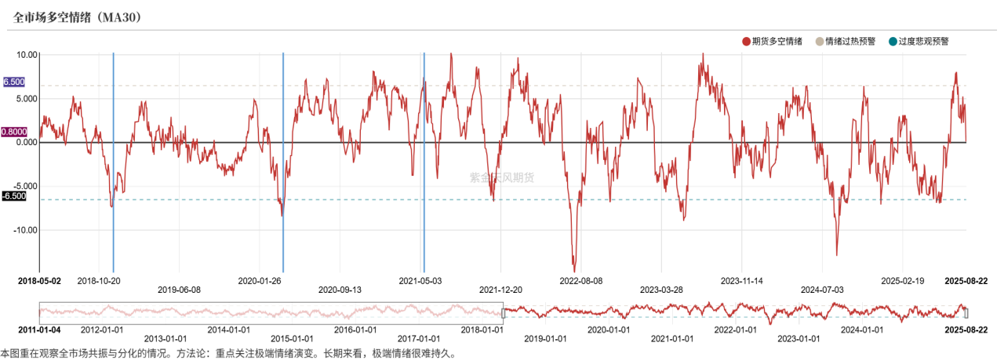 商品市场情绪近期大幅降温,多空情绪指标快速回落,来到中性位置。但接下来大概率在降息预期推动下,会出现新一轮升温。