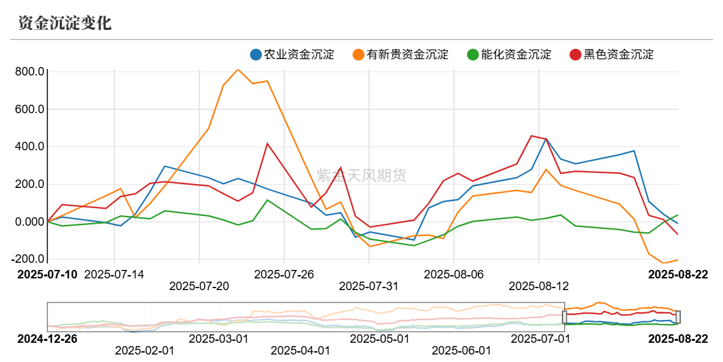 从商品市场资金流向来看,8月上半月各板块资金有所回流,但8月下旬商品市场回归基本面,涨势不及股市,各板块资金再次流出,能化板块资金波动不大。